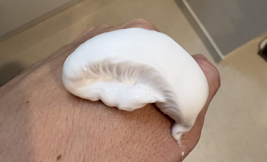 缶を振って出すだけで、最初からかなり濃い泡が出てきます。自分でネットを使って泡立てる必要がないので、朝の洗顔がかなり楽になります。
