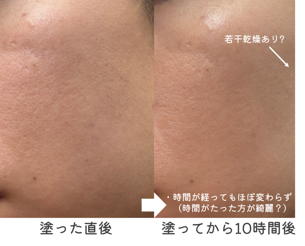 - 見た目:毛穴が隠れて、肌の凹凸が目立ちにくい。肌が明るくなる。