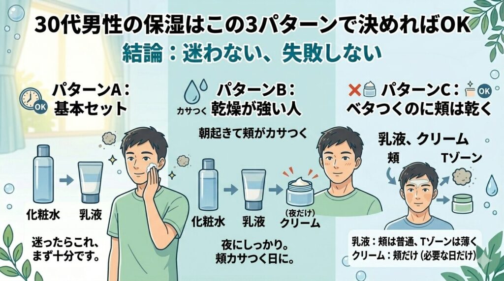 結論:30代男性の保湿はこの3パターンで決めればOK