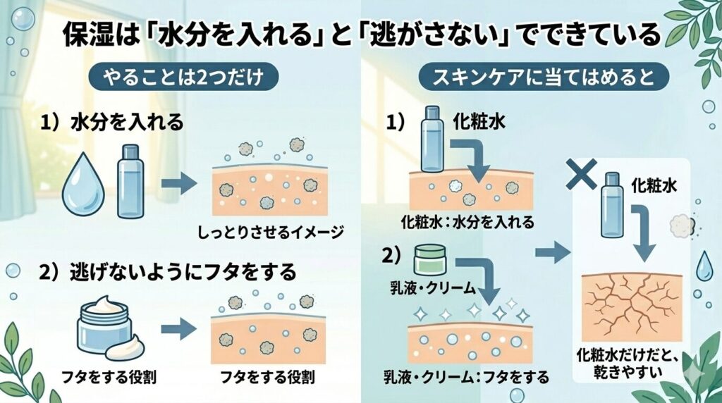 保湿っていうと「しっとりさせる」イメージですが、やることは2つだけです。